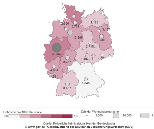 Im Jahr 2017 verzeichneten Versicherungen und Polizei rund ein Viertel weniger Einbrüche als im Jahr 2016. Hinzu kommt eine gestiegene Aufklärungsquote, die bei 15 Prozent lag, jedoch nun auf 20 Prozent gestiegen ist. Den Grund für die positive Entwicklung sieht die Polizei in den Fahndungserfolgen gegen Banden, die sich auf Einbrüche spezialisiert haben.